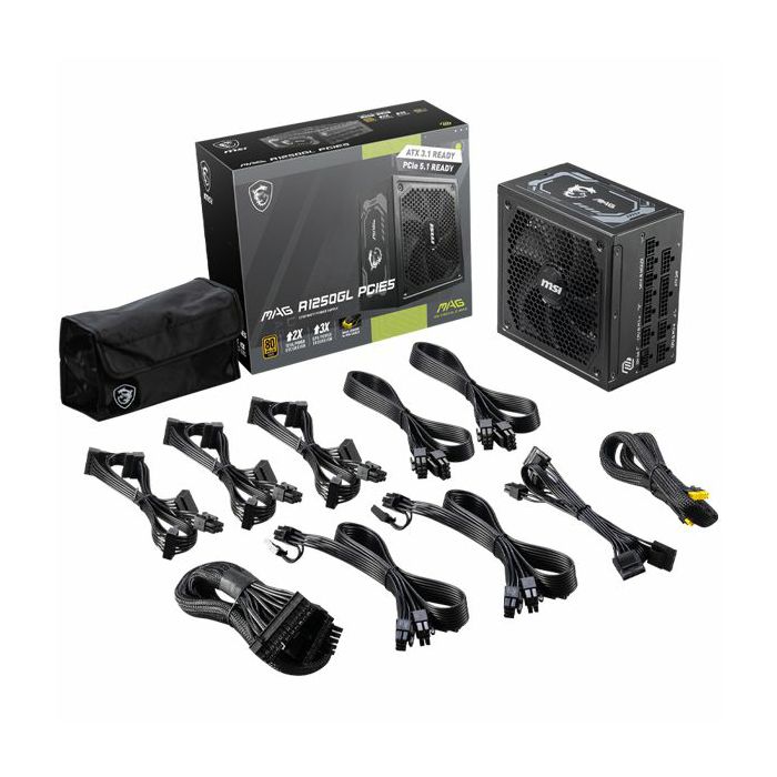 MSI MAG A1250GL PCIE5 Power Supply 1250W, 80 PLUS Gold, 135 mm Fan Size, Protections: OCP/OVP/OPP/OTP/SCP/UVP, Active PFC Design, Flat Cable Equipment, Dimensions: 150mmx150mmx86mm, 5Y Warranty