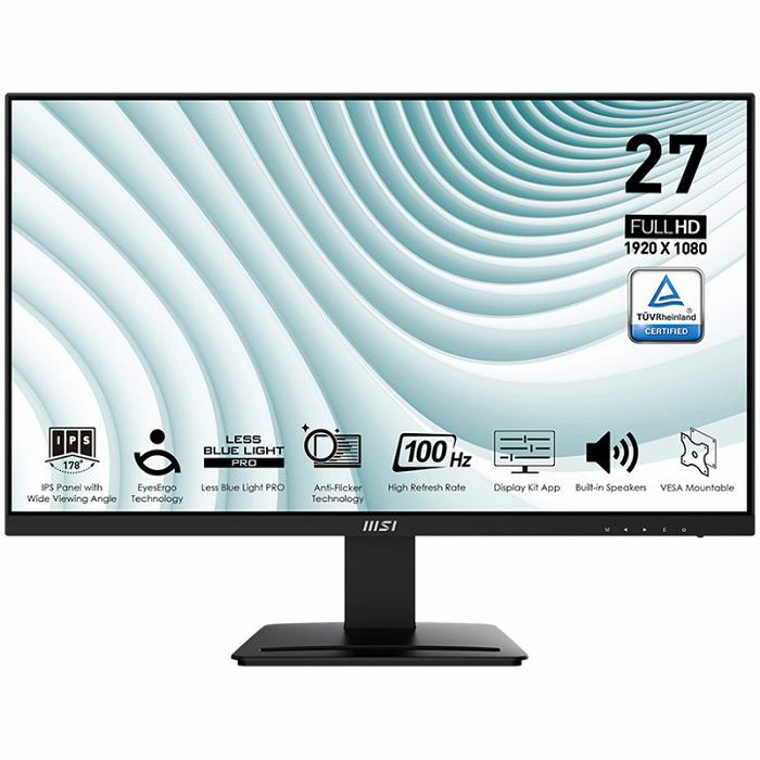 MSI PRO MP273A Professional Business Monitor, 27" 100Hz, FHD (1920 x 1080), 16:9, IPS, CR 1000:1, 1ms (MPRT) / 4ms (GTG), Anti-glare, 1x DP, 1x HDMI, 1x VGA, 2x 3W Speakers, VESA (75x75)